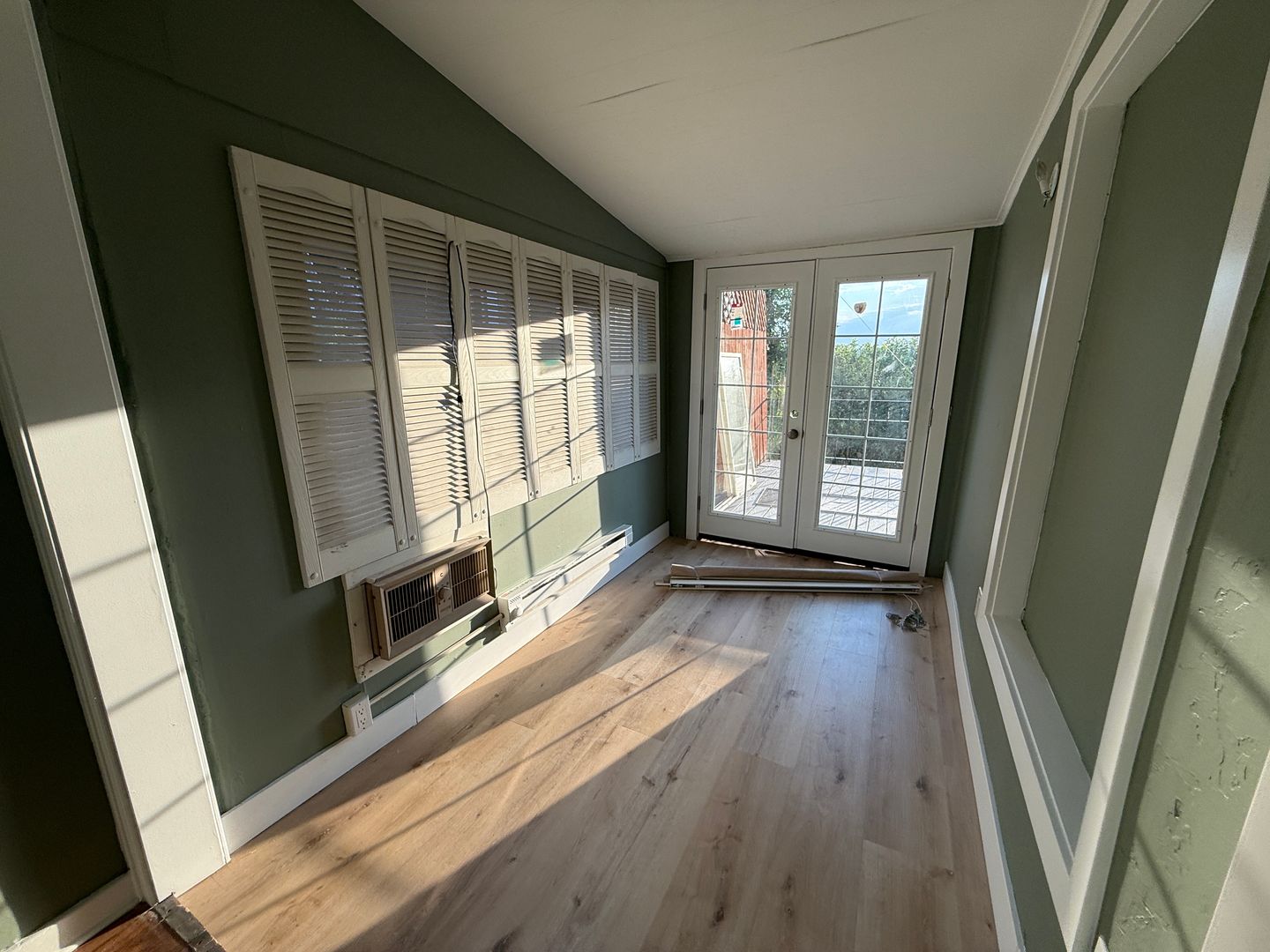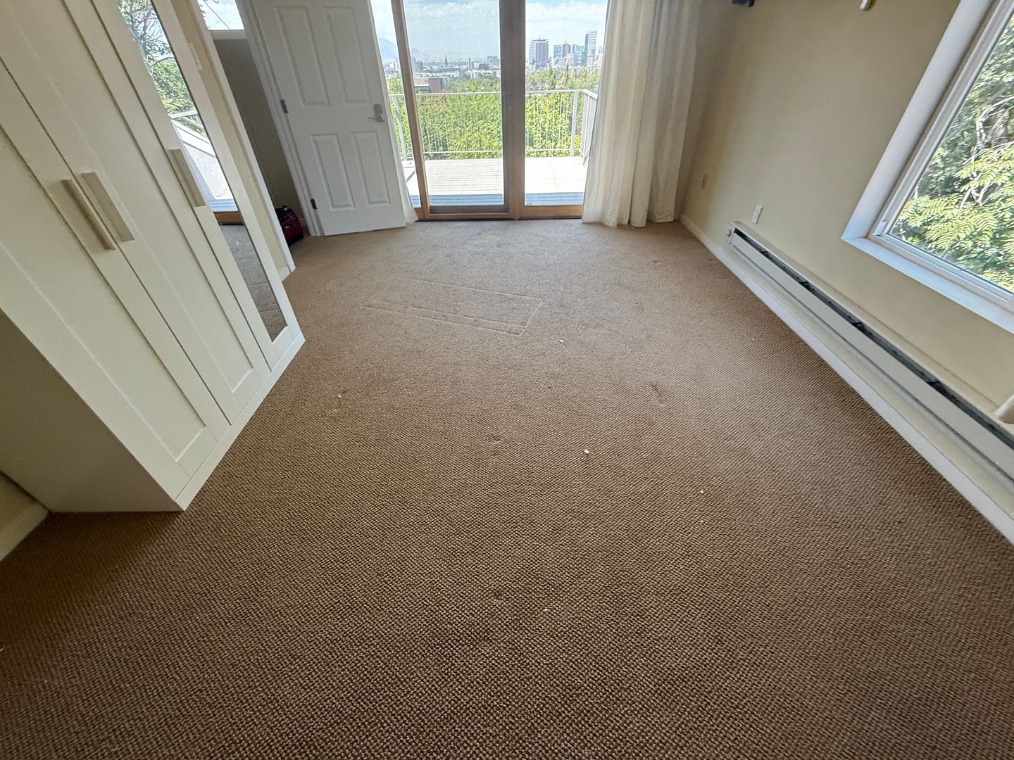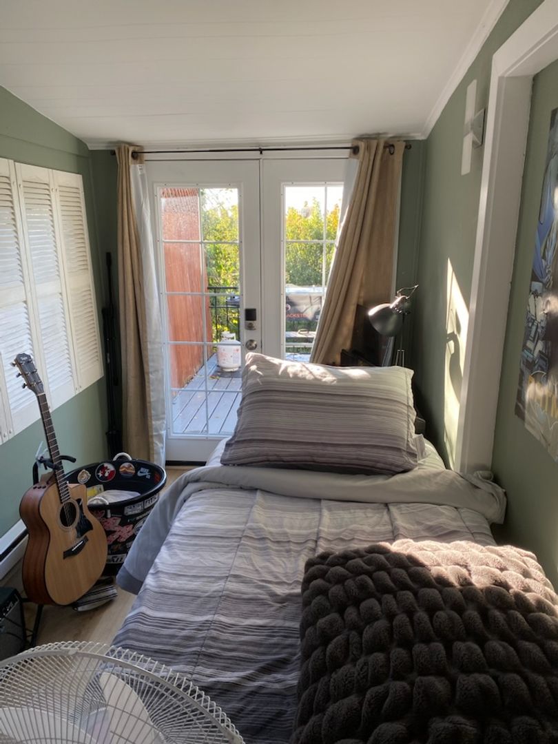Room E - 14x6.5 , this room is unique as it was a study/office with lots of windows, we added french door that allow you to step straight to the large balcony with stunning views, lots of windows, own window AC, ( Suggested Price for 9 people $950 or 8 people $1060) Pics 89-103, narrow so twin bed only see the tenant's set up )